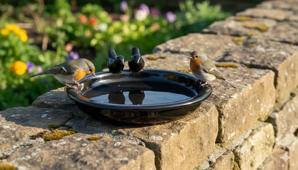Vogeltränke,dekorativ,zwei Vögelchen,schwarz glasiert,30 cm Wildvögel,Voliere