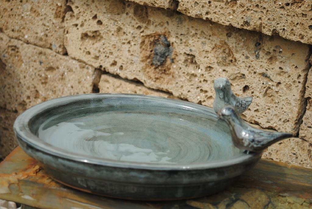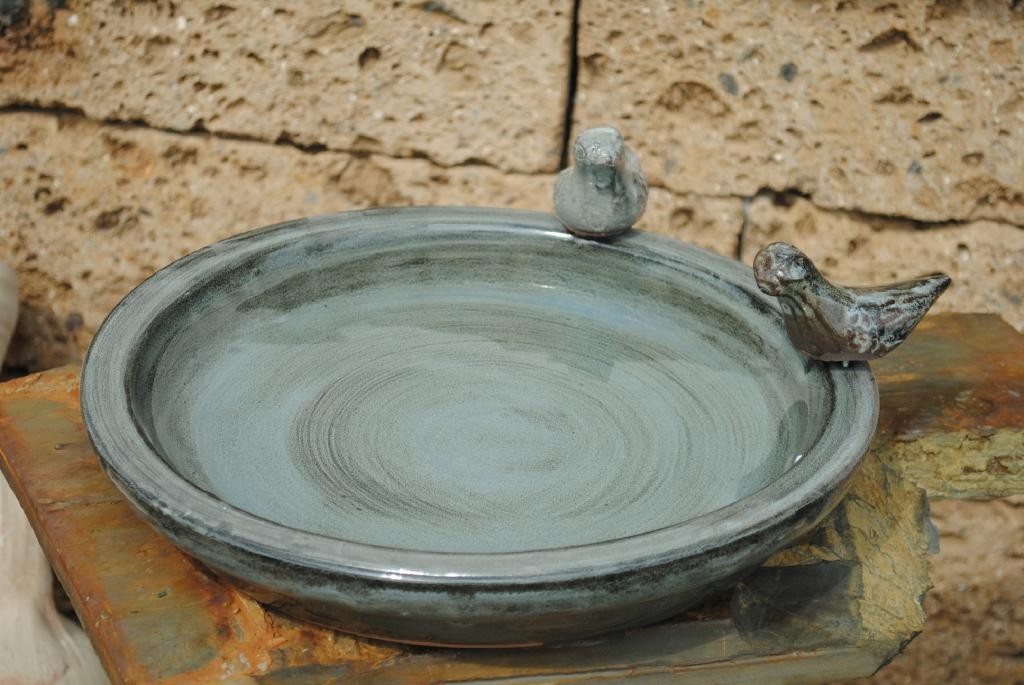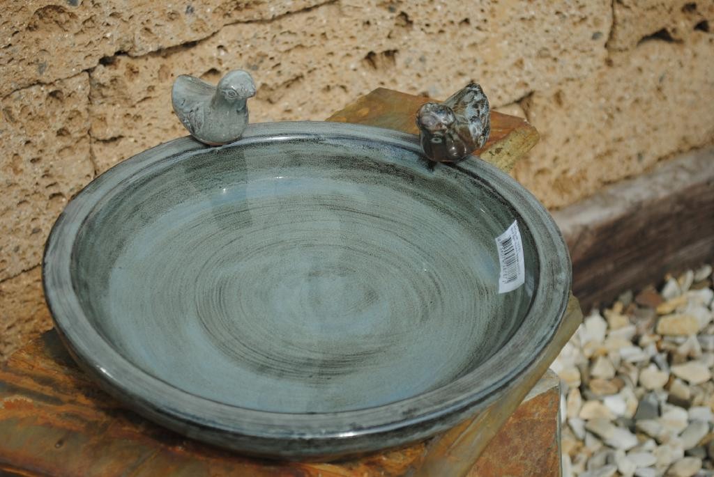 Vogeltränke mit zwei Vögelchen, rund, grau glasiert, 30cm,Wildvögel,Voliere,etc.